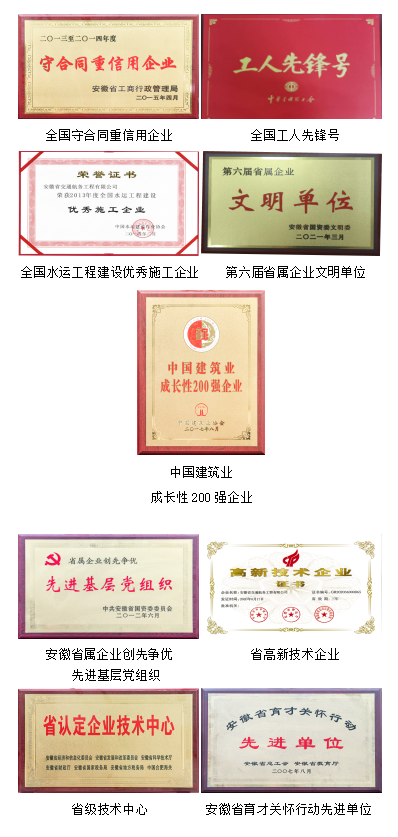 安徽省交通航務工程有限是安徽建工集團有限公司控股子公司,系安徽省首家市政特級資質企業(yè),已同集團公司整體上市(股票代碼:600502)。公司注冊資本10億元,資產總額近百億元。公司擁有市政公用工程、港口與航道工程、水利水電工程、公路工程、建筑工程、礦山工程、機電工程等7項施工總承包資質,同時具有環(huán)保、隧道、路基、路面、橋梁、航道、鋼結構、古建筑、河湖整治、地基基礎、裝飾裝修、地質災害處理、電子與智能化等13項專業(yè)承包資質及市政行業(yè)、建筑專業(yè)等2項設計資質。公司下設安徽省生態(tài)環(huán)境科技發(fā)展有限公司、安徽全椒建設投資有限公司等多家政企合作公司,安建品創(chuàng)檢測技術有限公司、設計公司、亳州建工有限公司等多個子分公司。公司是國家“守合同重信用”企業(yè),榮獲“高新技術企業(yè)”“全國工人先鋒號”“全國安康杯優(yōu)勝單位”“中國建筑業(yè)成長性企業(yè)200強”“安徽省建筑業(yè)50強”“安徽省優(yōu)秀建筑業(yè)企業(yè)綜合基礎設施工程-施工總承包類”“安徽省環(huán)境保護優(yōu)秀施工示范單位”“安徽省五一勞動獎狀”“平安工程”“合肥市預選承包商”等。承建項目多次榮獲魯班獎、全國市政金杯獎、黃山杯等榮譽。